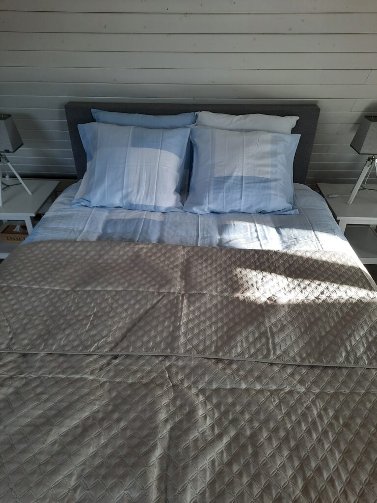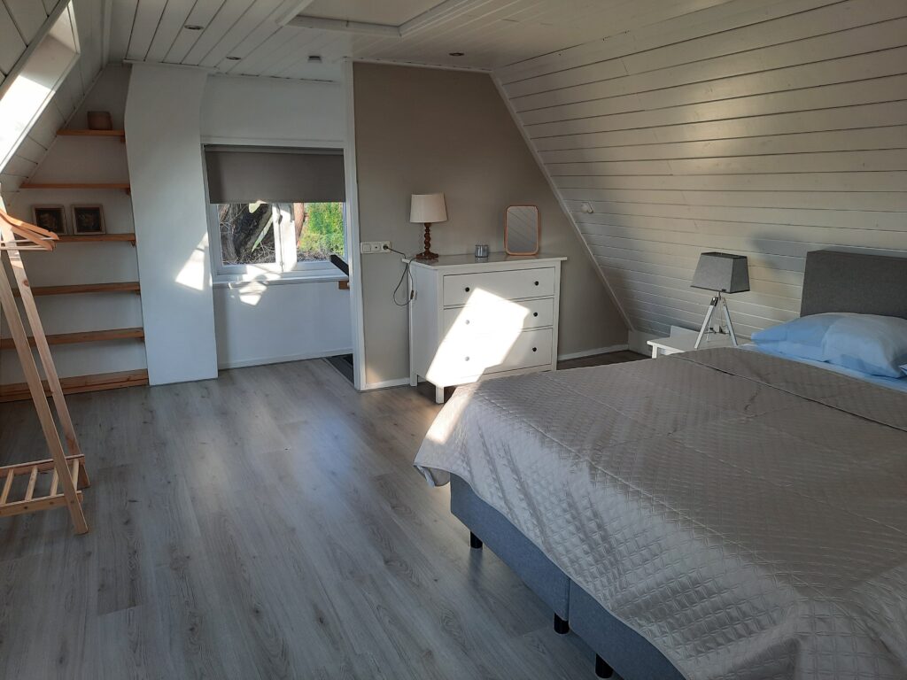 De slaapkamer is voorzien van een heerlijke boxspring van 160 x 210, opgemaakt als één bed. De dubbele kussens zorgen ervoor dat je nog even prettig rechtop kunt zitten met een boek. Wil je net voor het slapen gaan nog even bijkomen van de dag? Geniet lekker op een gemakkelijke stoel met een koffie of drankje. Vanuit bed of een relaxte stoel kijk je je favoriete serie op de TV. Kijk ‘gewoon’ TV met een TV-ontvanger of gebruik de aangesloten Chromecast. De slaapkamer heeft een heerlijke lichtinval, maar is ook goed donker te maken door de verduisteringsgordijnen.