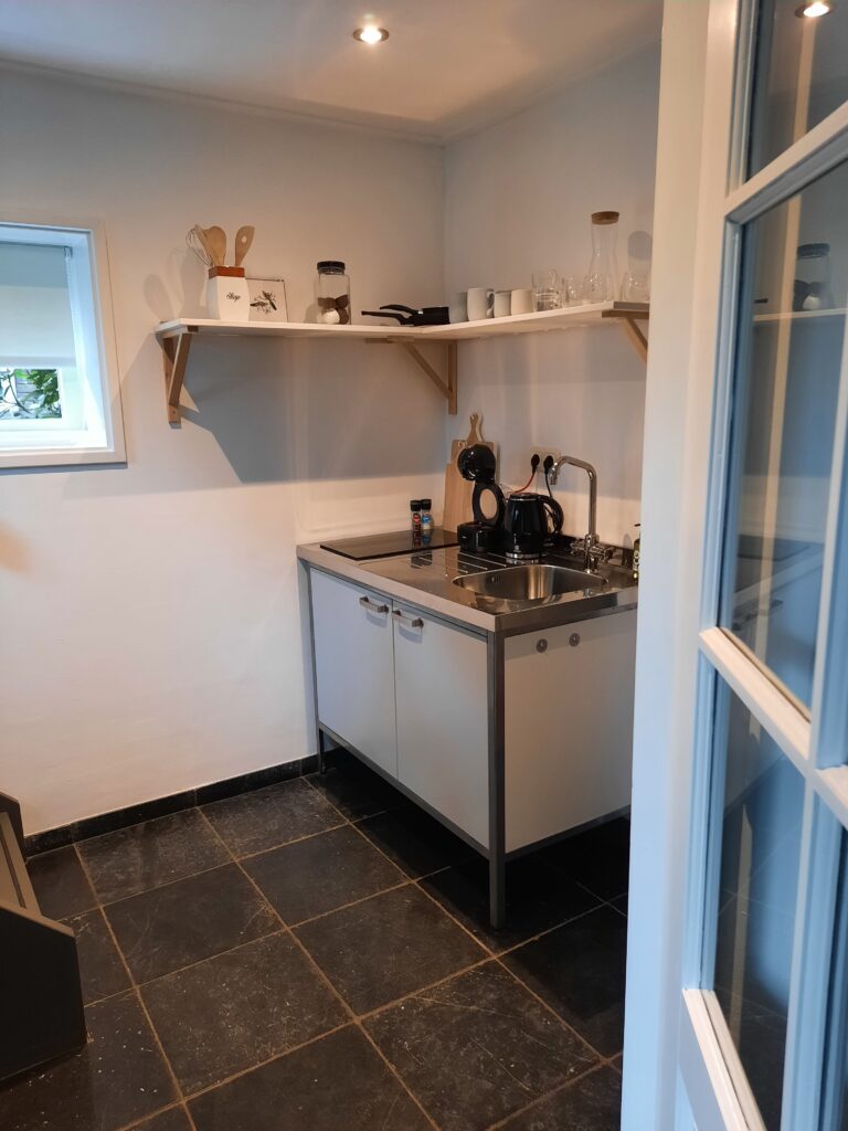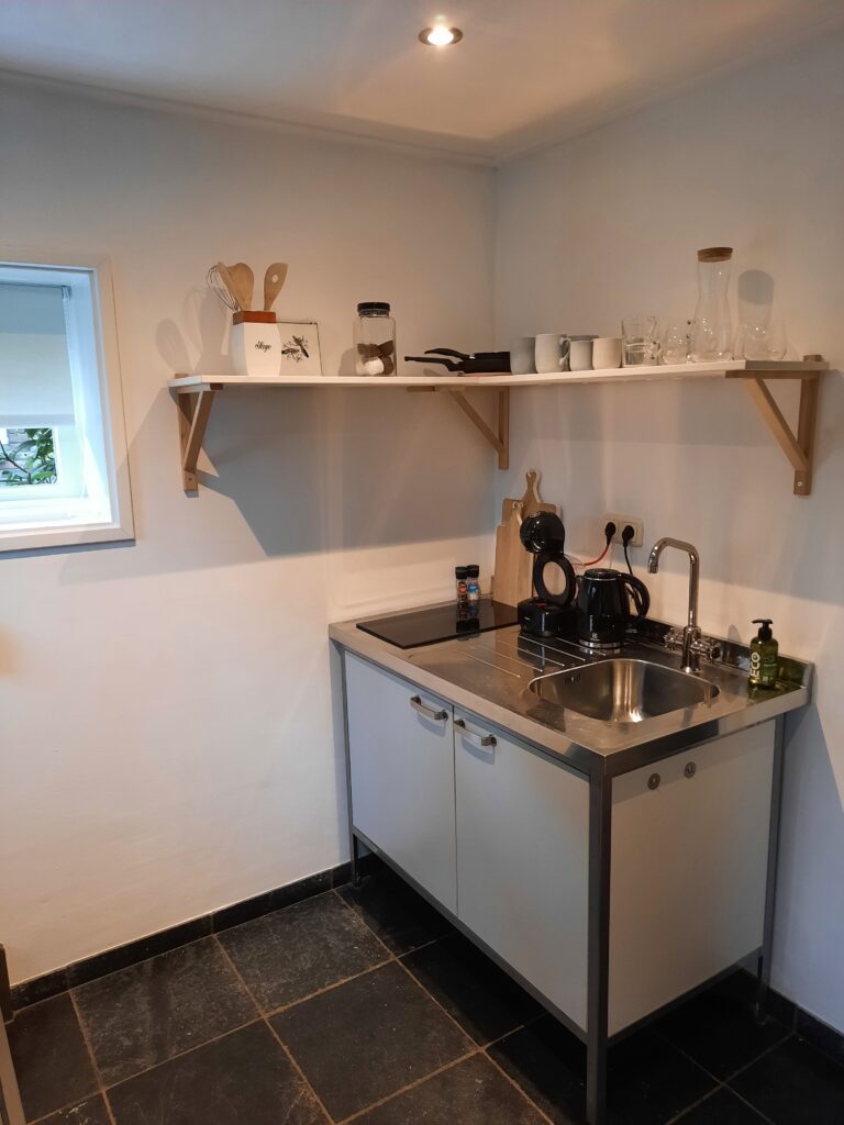 Het keukentje is voorzien van een kookplaat met 2 pitten en enkele pannen. Prima voor het bereiden van een ei of opwarmen van een maaltijd.