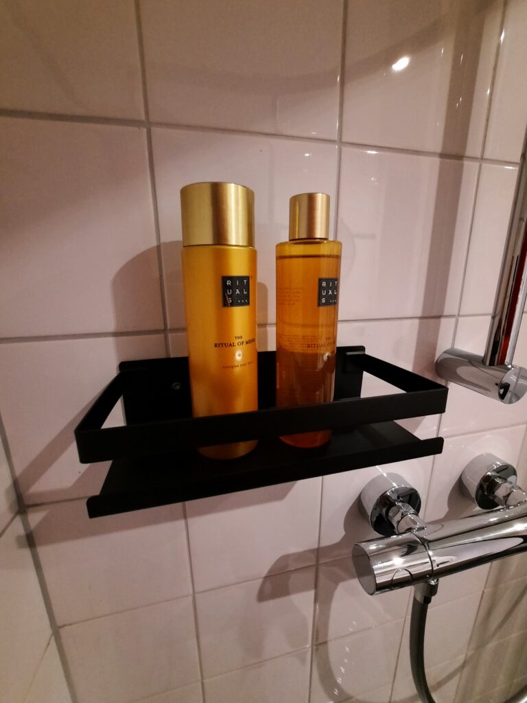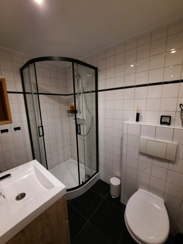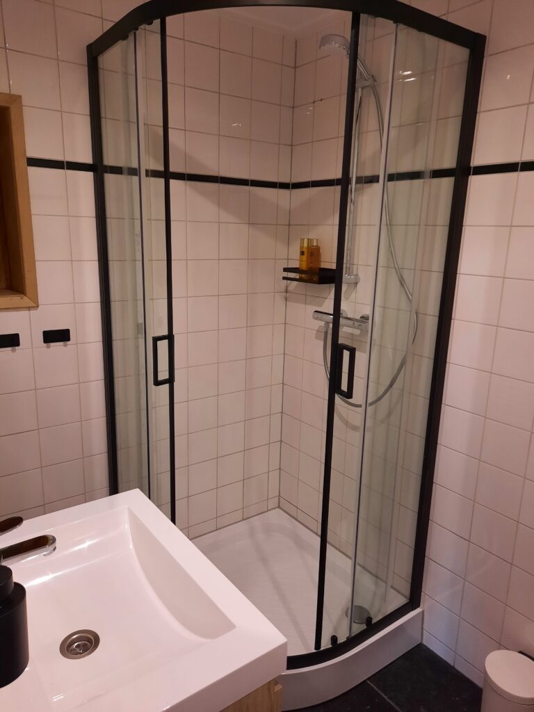 Geniet van een ruime douchehoek, genoeg haakjes en houders voor al je spullen en een ruim toilet. De designradiator laat je handdoek snel drogen!